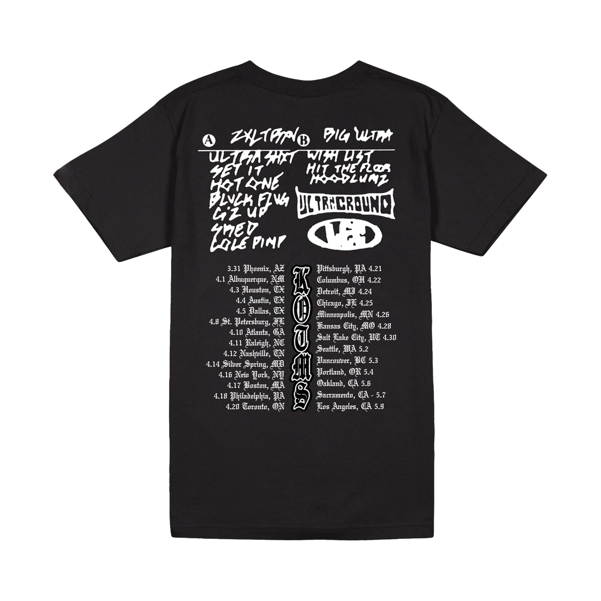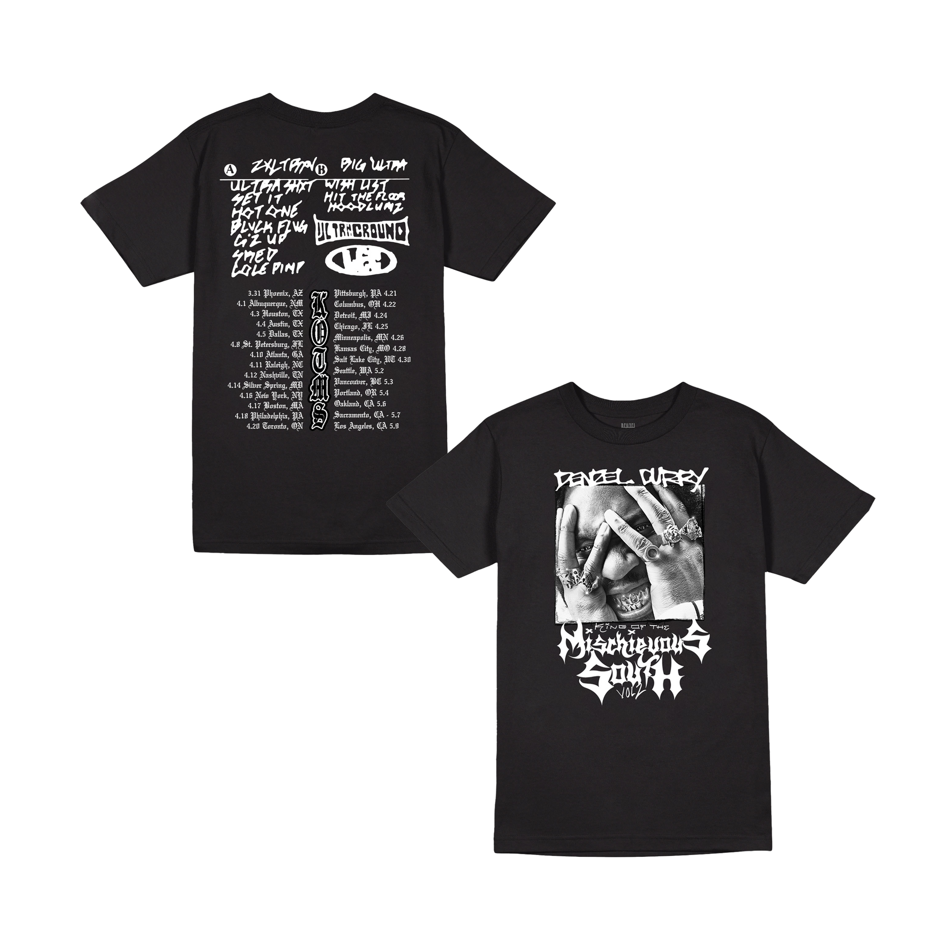 Mixtape 2025 Tour design printed on a black 100% cotton t-shirt featuring tour dates on the back.